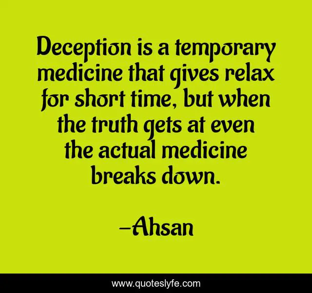 This page presents the quote "Deception is a temporary medicine that gives relax for short time, but when the truth gets at even the actual medicine breaks down.". Author of this quote is Ahsan. .