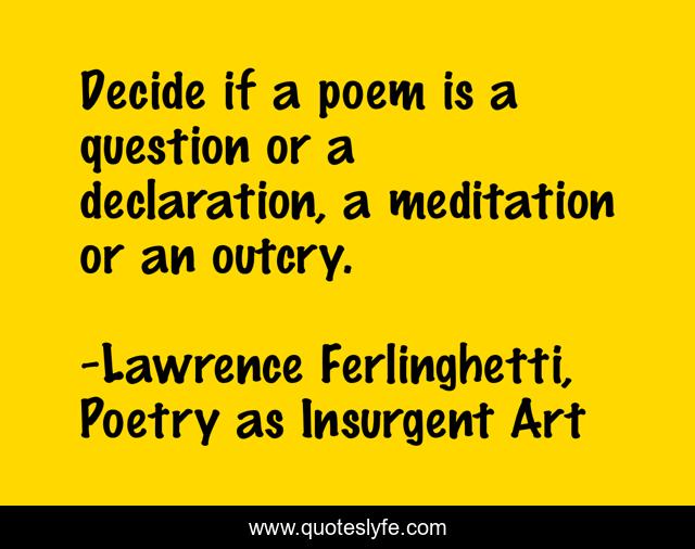 This page presents the quote "Decide if a poem is a question or a declaration, a meditation or an outcry.". Author of this quote is Lawrence Ferlinghetti, Poetry as Insurgent Art. .
