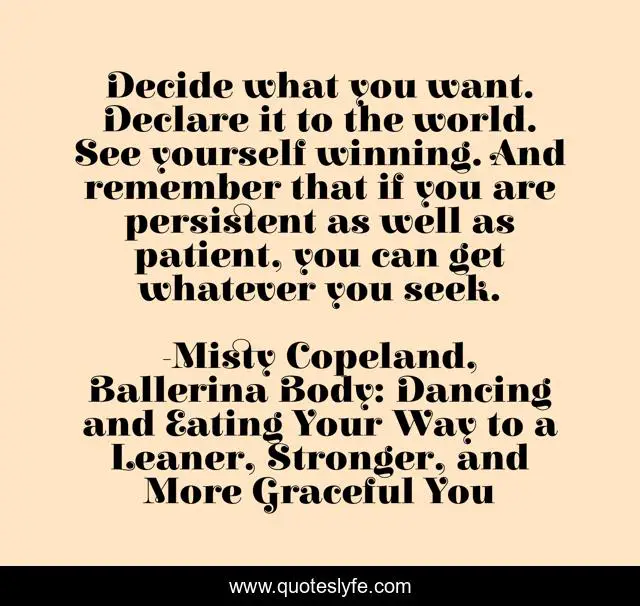 This page presents the quote "Decide what you want. Declare it to the world. See yourself winning. And remember that if you are persistent as well as patient, you can get whatever you seek.". Author of this quote is Misty Copeland, Ballerina Body: Dancing and Eating Your Way to a Leaner, Stronger, and More Graceful You. .
