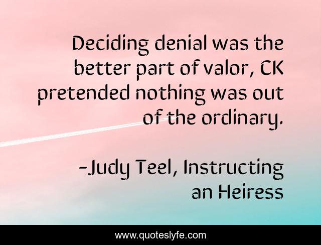 This page presents the quote "Deciding denial was the better part of valor, CK pretended nothing was out of the ordinary.". Author of this quote is Judy Teel, Instructing an Heiress. This quote is about pretend, denial, valor,.