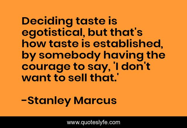 This page presents the quote "Deciding taste is egotistical, but that's how taste is established, by somebody having the courage to say, 'I don't want to sell that.'". Author of this quote is Stanley Marcus. .