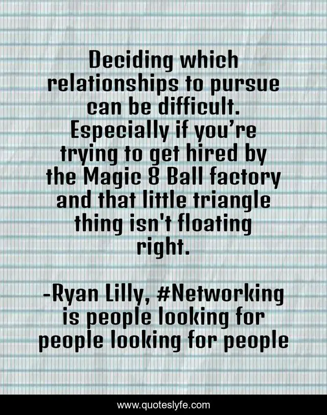 This page presents the quote "Deciding which relationships to pursue can be difficult. Especially if you’re trying to get hired by the Magic 8 Ball factory and that little triangle thing isn't floating right.". Author of this quote is Ryan Lilly, #Networking is people looking for people looking for people. This quote is about relationships, fortune-telling, magic-8-ball, factory, fortune, networking, magic, manufacturing, decisions,.