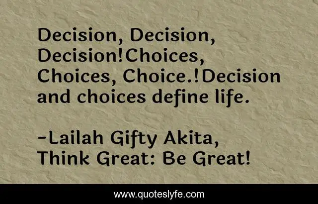 "Lailah Gifty Akita, Think Great: Be Great! Quotes." Quoteslyfe.com, 2025. Fri. 05 Dec. 2025. <https://www.quoteslyfe.com/quote/Decision-Decision-Decision-Choices-Choices-Choice-Decision-174833>.