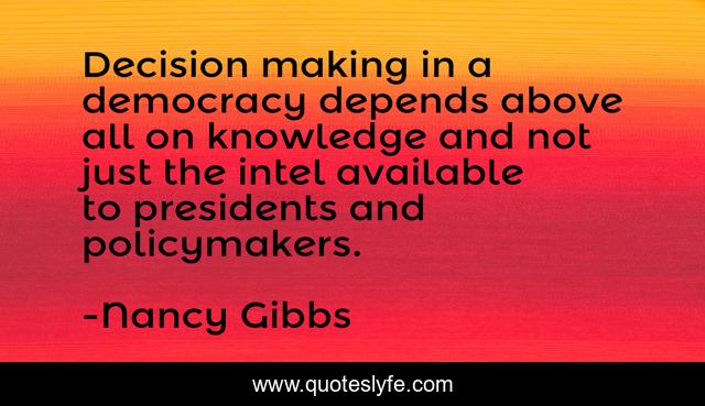 This page presents the quote "Decision making in a democracy depends above all on knowledge and not just the intel available to presidents and policymakers.". Author of this quote is Nancy Gibbs. This quote is about decision, democracy, just,.