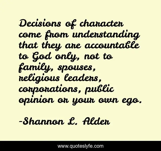 This page presents the quote "Decisions of character come from understanding that they are accountable to God only, not to family, spouses, religious leaders, corporations, public opinion or your own ego.". Author of this quote is Shannon L. Alder. This quote is about faithfulness, blaming-others, lies, fears, godly, character, spirituality, leadership, courage,.