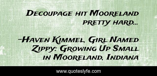 This page presents the quote "Decoupage hit Mooreland pretty hard...". Author of this quote is Haven Kimmel, Girl Named Zippy: Growing Up Small in Mooreland, Indiana. This quote is about funny, comedy,.