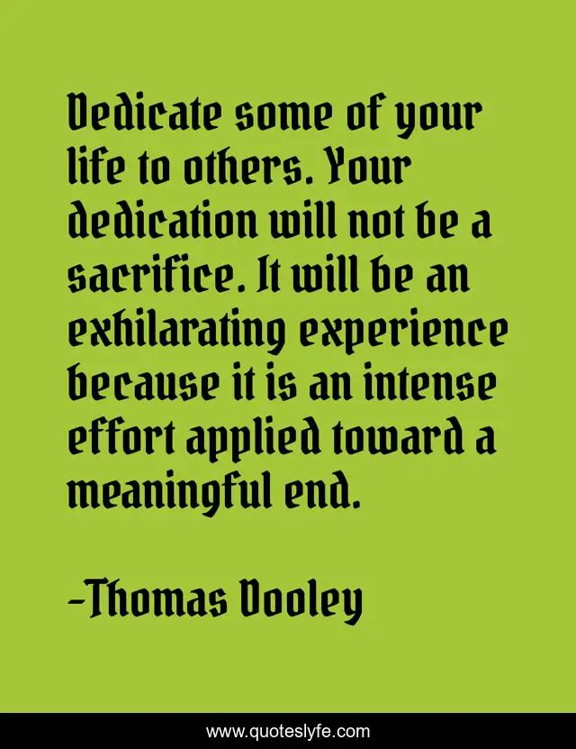 This page presents the quote "Dedicate some of your life to others. Your dedication will not be a sacrifice. It will be an exhilarating experience because it is an intense effort applied toward a meaningful end.". Author of this quote is Thomas Dooley. .