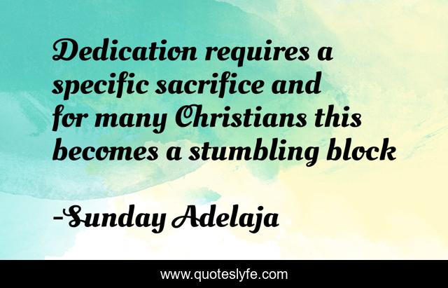 This page presents the quote "Dedication requires a specific sacrifice and for many Christians this becomes a stumbling block". Author of this quote is Sunday Adelaja. This quote is about prosperity, wealth, becomes, sacrifice, riches, specific, christians, money, dedication,.