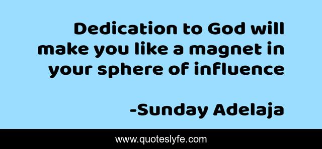 This page presents the quote "Dedication to God will make you like a magnet in your sphere of influence". Author of this quote is Sunday Adelaja. This quote is about prosperity, like, god, make, influence, magnet, sphere, dedication, money-riches,.