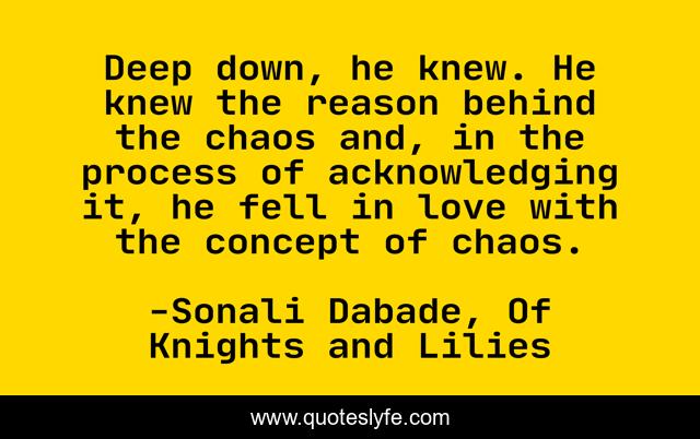 This page presents the quote "Deep down, he knew. He knew the reason behind the chaos and, in the process of acknowledging it, he fell in love with the concept of chaos.". Author of this quote is Sonali Dabade, Of Knights and Lilies. This quote is about love, chaos, affection,.