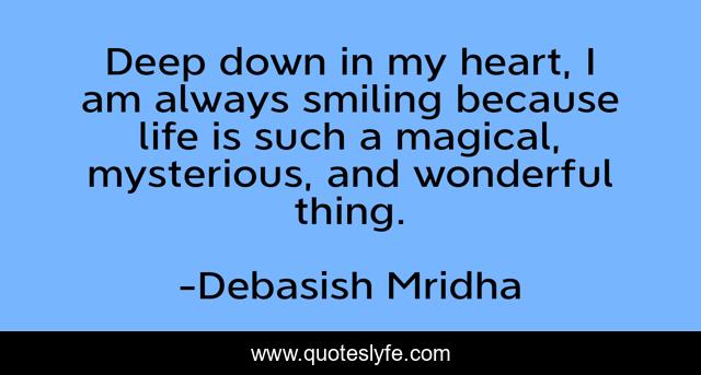 This page presents the quote "Deep down in my heart, I am always smiling because life is such a magical, mysterious, and wonderful thing.". Author of this quote is Debasish Mridha. This quote is about life-is-magical, inspirational, philosophy, debasish-mridha, quotes, debasish-mridha-md, deep-down-in-my-heart, enthusiasm, smiling,.