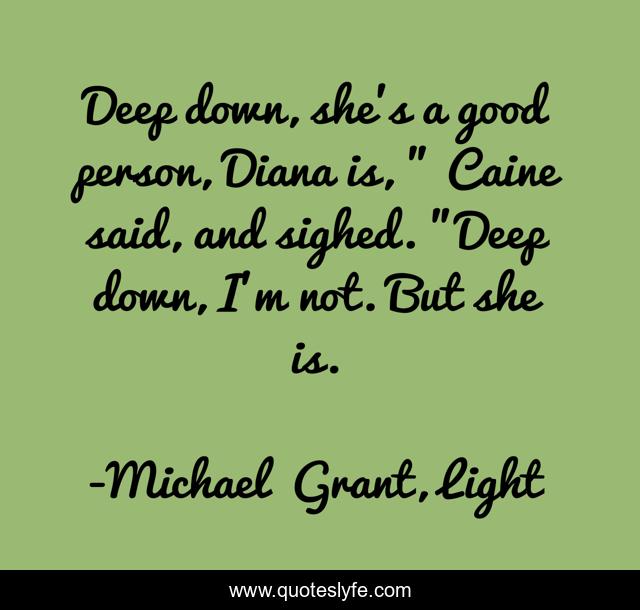 This page presents the quote "Deep down, she's a good person, Diana is, " Caine said, and sighed. "Deep down, I'm not. But she is.". Author of this quote is Michael Grant, Light. This quote is about good-and-evil, love, affection,.