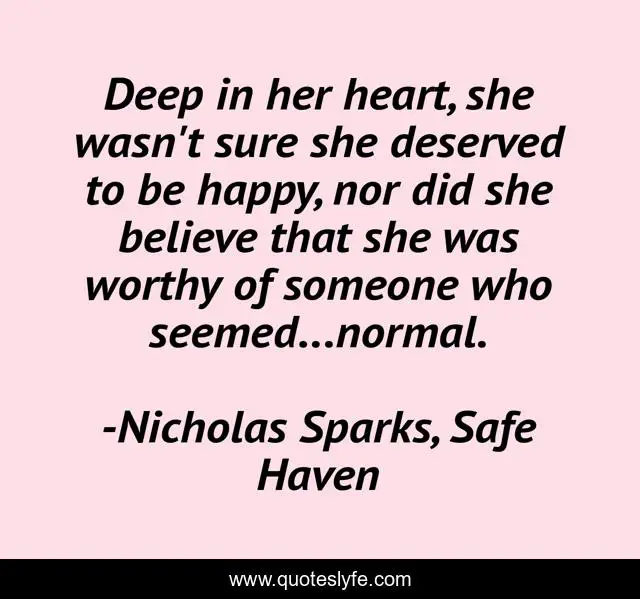 This page presents the quote "Deep in her heart, she wasn't sure she deserved to be happy, nor did she believe that she was worthy of someone who seemed...normal.". Author of this quote is Nicholas Sparks, Safe Haven. This quote is about love, deserve-love, love-worth, nicholas-sparks, safe-haven, affection,.