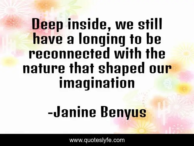 This page presents the quote "Deep inside, we still have a longing to be reconnected with the nature that shaped our imagination". Author of this quote is Janine Benyus. This quote is about sustainability, environmental-protection, nature,.