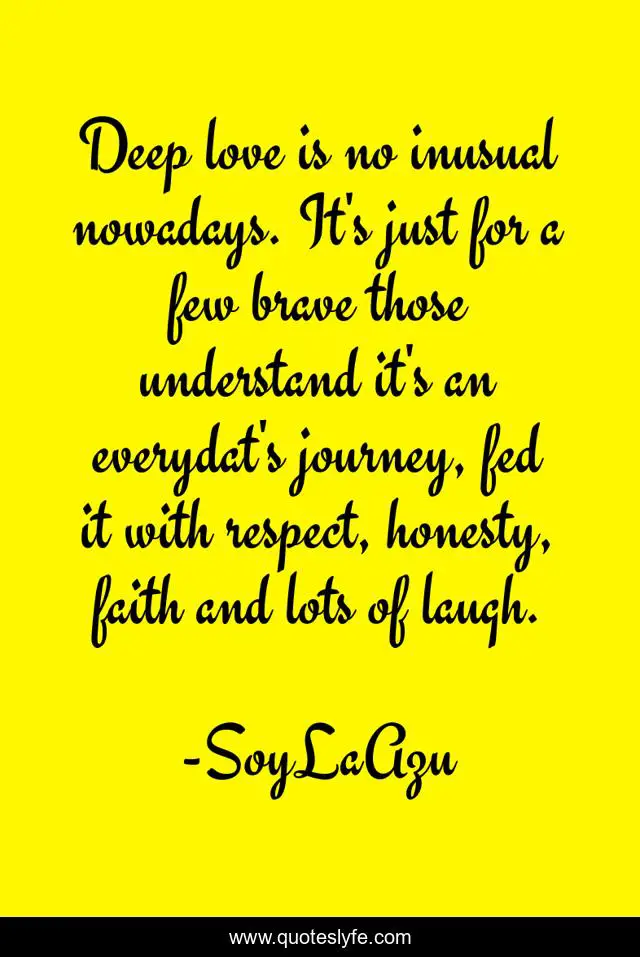 This page presents the quote "Deep love is no inusual nowadays. It's just for a few brave those understand it's an everydat's journey, fed it with respect, honesty, faith and lots of laugh.". Author of this quote is SoyLaAzu. This quote is about true-love, respect, love, honesty, affection,.