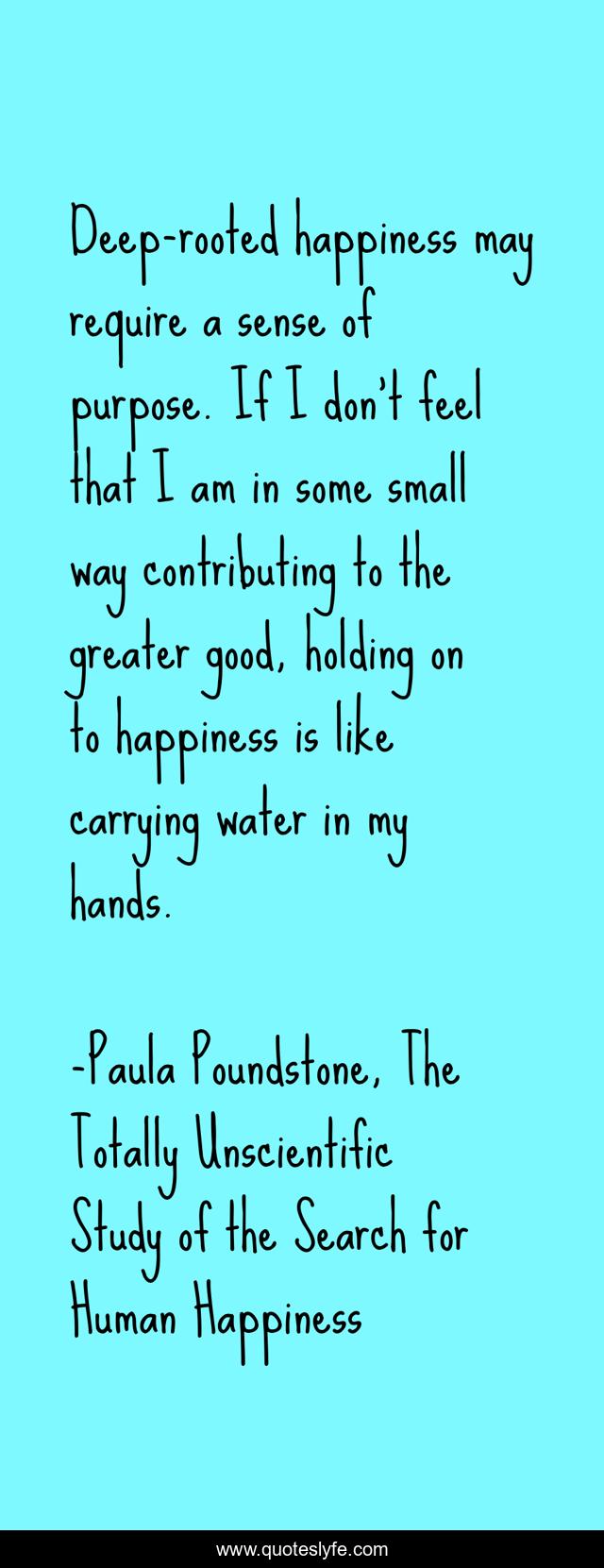 This page presents the quote "Deep-rooted happiness may require a sense of purpose. If I don't feel that I am in some small way contributing to the greater good, holding on to happiness is like carrying water in my hands.". Author of this quote is Paula Poundstone, The Totally Unscientific Study of the Search for Human Happiness. This quote is about community, happiness, purpose,.