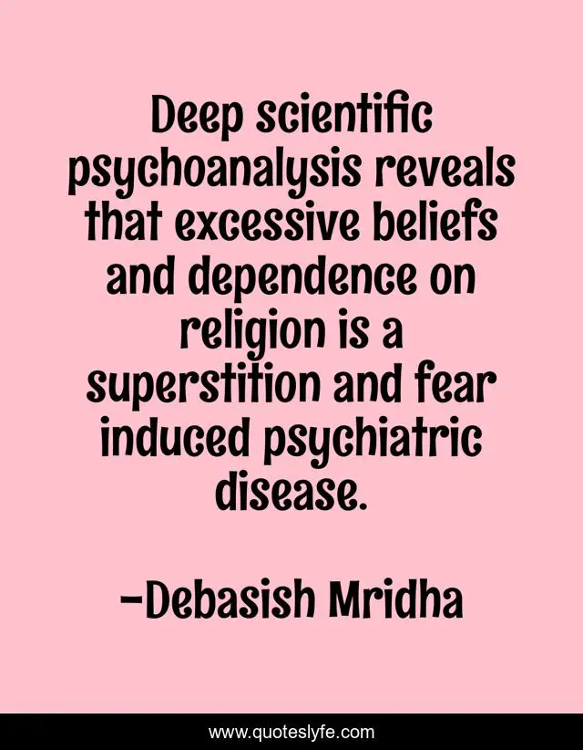 This page presents the quote "Deep scientific psychoanalysis reveals that excessive beliefs and dependence on religion is a superstition and fear induced psychiatric disease.". Author of this quote is Debasish Mridha. This quote is about quotes, philosophy, debasish-mridha, superstition, religion, debasish-mridha-md, inspirational, enthusiasm, psychoanalysis,.