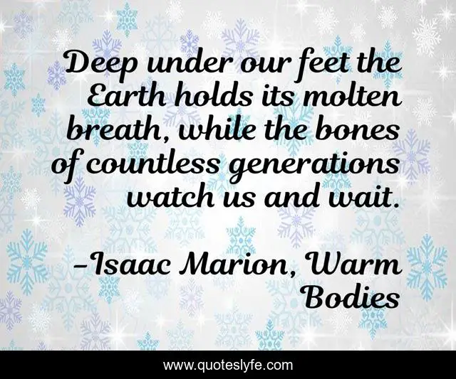 This page presents the quote "Deep under our feet the Earth holds its molten breath, while the bones of countless generations watch us and wait.". Author of this quote is Isaac Marion, Warm Bodies. This quote is about earth, waiting, generations,.