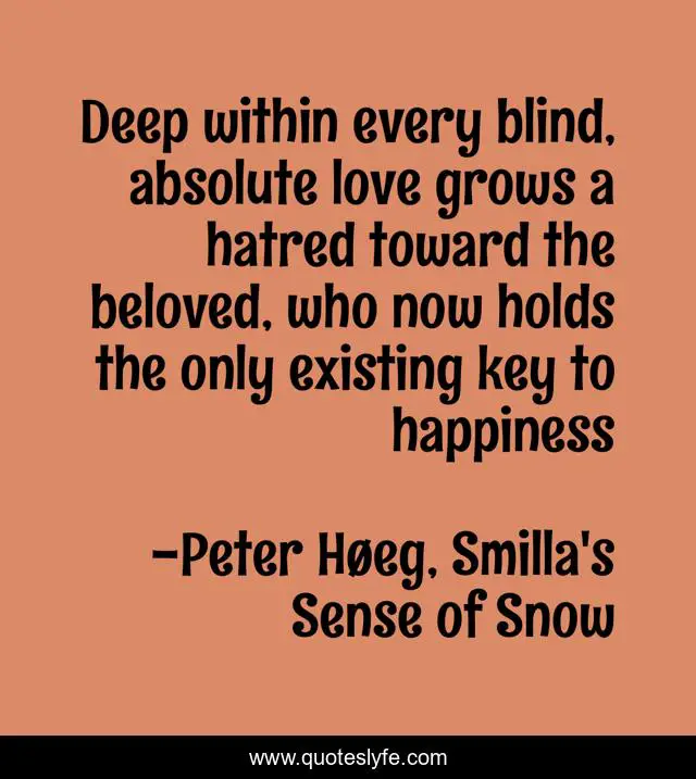 This page presents the quote "Deep within every blind, absolute love grows a hatred toward the beloved, who now holds the only existing key to happiness". Author of this quote is Peter Høeg, Smilla's Sense of Snow. This quote is about hatred, love, affection, insightful,.