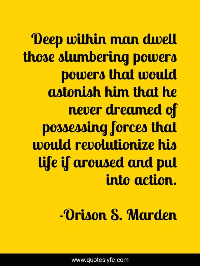 This page presents the quote "Deep within man dwell those slumbering powers powers that would astonish him that he never dreamed of possessing forces that would revolutionize his life if aroused and put into action.". Author of this quote is Orison S. Marden. .