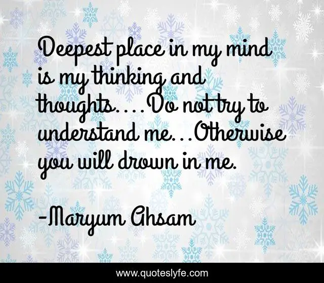 This page presents the quote "Deepest place in my mind is my thinking and thoughts....Do not try to understand me...Otherwise you will drown in me.". Author of this quote is Maryum Ahsam. This quote is about thinking-with-a-great-mind, thinking, my-own-writings-and, thoughts-of-the-mind, deep-feelings, deep-thoughts,.