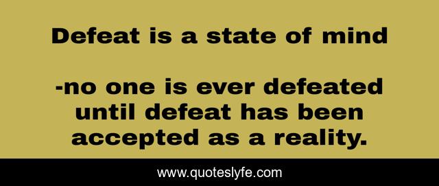 This page presents the quote "Defeat is a state of mind". Author of this quote is no one is ever defeated until defeat has been accepted as a reality.. .