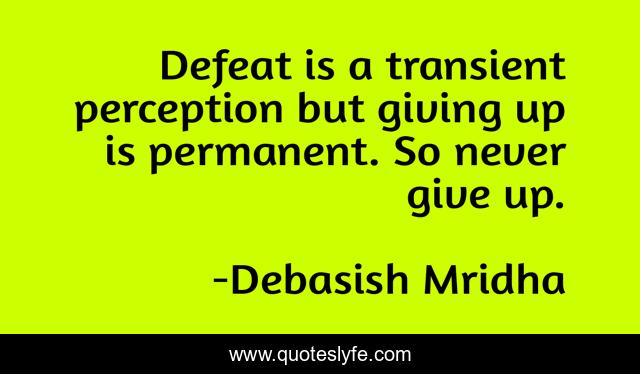 This page presents the quote "Defeat is a transient perception but giving up is permanent. So never give up.". Author of this quote is Debasish Mridha. This quote is about life, love, knowledge, inspirational, intelligence, philosophy, wisdom, quotes, affection,.
