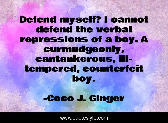 This page presents the quote "Defend myself? I cannot defend the verbal repressions of a boy. A curmudgeonly, cantankerous, ill-tempered, counterfeit boy.". Author of this quote is Coco J. Ginger. This quote is about love, defensiveness, boys, silence, love-story, jamie-weise, affection,.