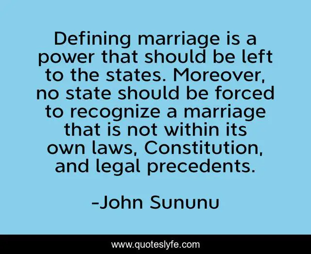 This page presents the quote "Defining marriage is a power that should be left to the states. Moreover, no state should be forced to recognize a marriage that is not within its own laws, Constitution, and legal precedents.". Author of this quote is John Sununu. This quote is about marriage, power,.