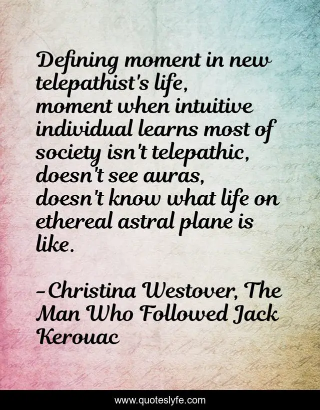 This page presents the quote "Defining moment in new telepathist's life, moment when intuitive individual learns most of society isn't telepathic, doesn't see auras, doesn't know what life on ethereal astral plane is like.". Author of this quote is Christina Westover, The Man Who Followed Jack Kerouac. This quote is about literature, jack-kerouac, auras, beatnik, photography, poetry, san-francisco, fiction, awakening,.