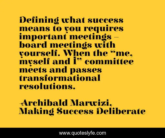 This page presents the quote "Defining what success means to you requires important meetings – board meetings with yourself. When the “me, myself and I” committee meets and passes transformational resolutions.". Author of this quote is Archibald Marwizi, Making Success Deliberate. This quote is about life, success, behaviour, attitude, legacy, growth, purpose, inspirational, leadership,.