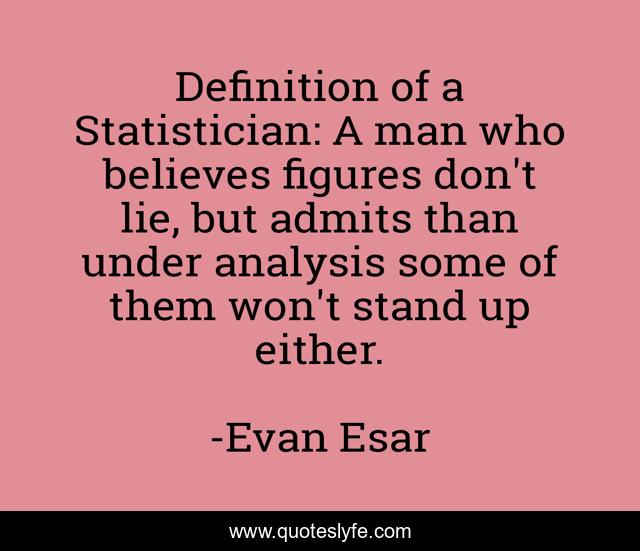 This page presents the quote "Definition of a Statistician: A man who believes figures don't lie, but admits than under analysis some of them won't stand up either.". Author of this quote is Evan Esar. This quote is about lie, man, stand up,.
