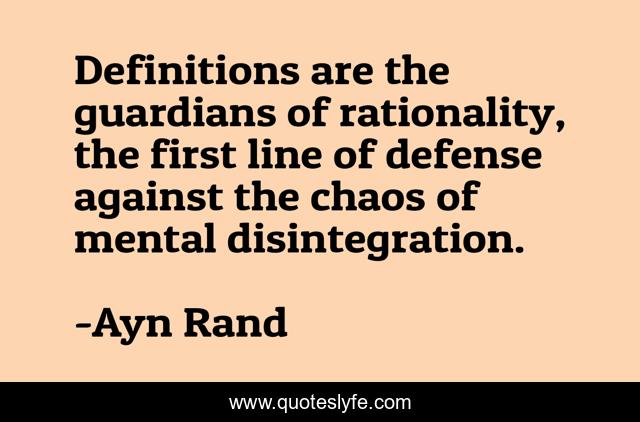 This page presents the quote "Definitions are the guardians of rationality, the first line of defense against the chaos of mental disintegration.". Author of this quote is Ayn Rand. This quote is about epistemology, reason, philosophy,.