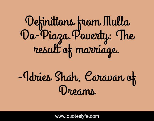 This page presents the quote "Definitions from Mulla Do-Piaza.Poverty: The result of marriage.". Author of this quote is Idries Shah, Caravan of Dreams. This quote is about society, proverb, sufis, marriage, sufism,.