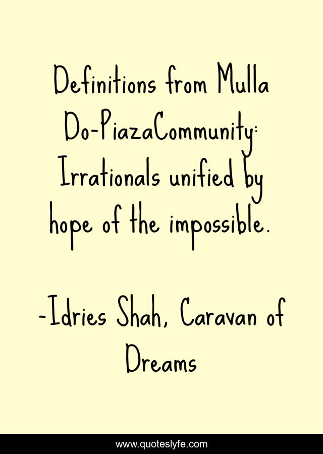 This page presents the quote "Definitions from Mulla Do-PiazaCommunity: Irrationals unified by hope of the impossible.". Author of this quote is Idries Shah, Caravan of Dreams. This quote is about society, sufis, psychology, community, sufism,.