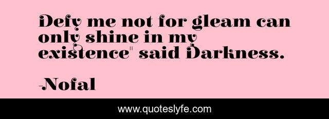 This page presents the quote "Defy me not for gleam can only shine in my existence" said Darkness.". Author of this quote is Nofal. This quote is about positive-thoughts, reality-of-life, blessings-in-disguise, positive-thinking,.