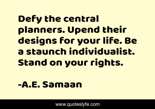 This page presents the quote "Defy the central planners. Upend their designs for your life. Be a staunch individualist. Stand on your rights.". Author of this quote is A.E. Samaan. This quote is about libertarian-party, individual-rights, individualist, libertarian, libertarianism, central-planners, progressivism, individual-liberty, socialism,.