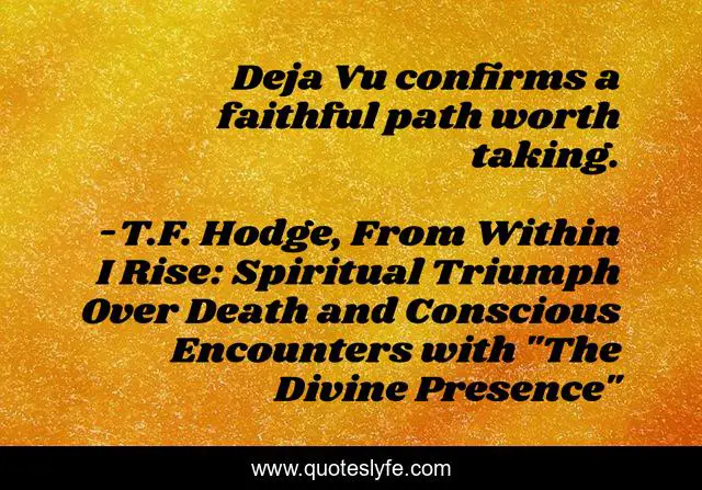 "T.F. Hodge, From Within I Rise: Spiritual Triumph Over Death and Conscious Encounters with "The Divine Presence" Quotes." Quoteslyfe.com, 2025. Tue. 09 Dec. 2025. <https://www.quoteslyfe.com/quote/Deja-Vu-confirms-a-faithful-path-worth-207202>.