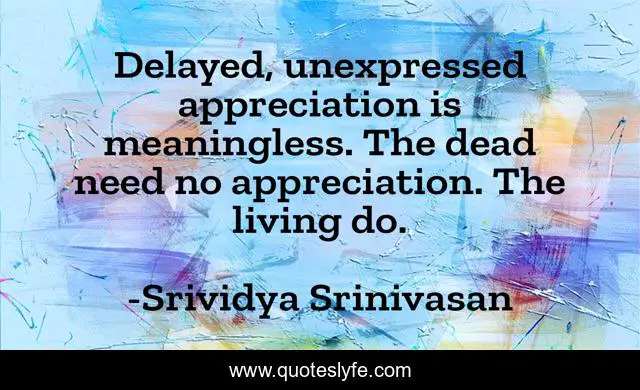 This page presents the quote "Delayed, unexpressed appreciation is meaningless. The dead need no appreciation. The living do.". Author of this quote is Srividya Srinivasan. This quote is about appreciation, meaninglessness, dead, living,.