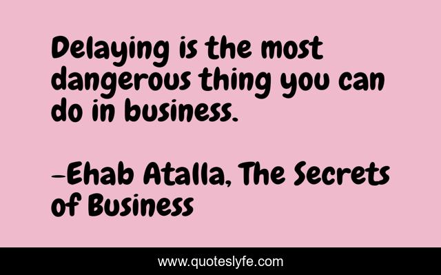 This page presents the quote "Delaying is the most dangerous thing you can do in business.". Author of this quote is Ehab Atalla, The Secrets of Business. This quote is about entrepreneur, business, entrepreneurship,.