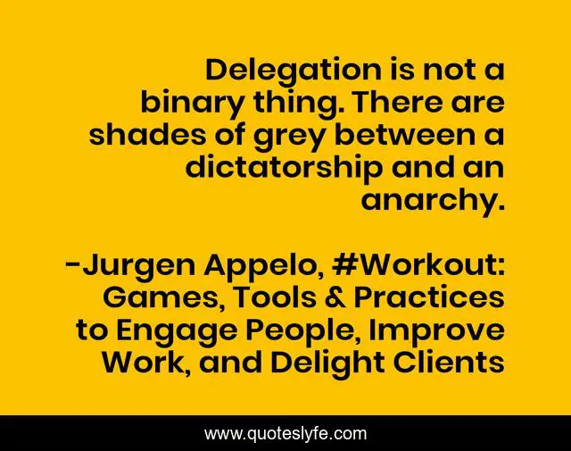 This page presents the quote "Delegation is not a binary thing. There are shades of grey between a dictatorship and an anarchy.". Author of this quote is Jurgen Appelo, #Workout: Games, Tools & Practices to Engage People, Improve Work, and Delight Clients. This quote is about delegation, agile, leadership, management, authority,.