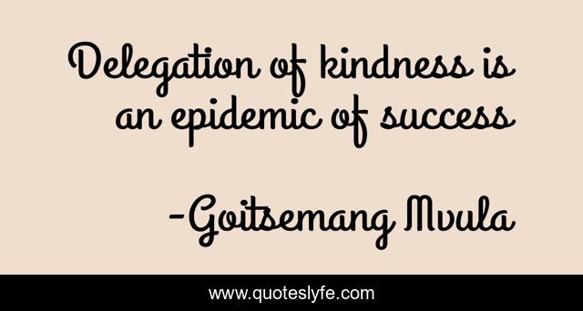 This page presents the quote "Delegation of kindness is an epidemic of success". Author of this quote is Goitsemang Mvula. This quote is about life, project-management, love, success, business, work, kindness, affection, inspiration,.