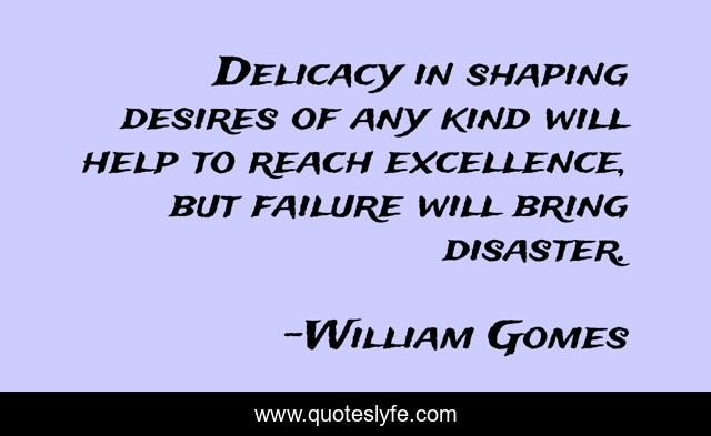 This page presents the quote "Delicacy in shaping desires of any kind will help to reach excellence, but failure will bring disaster.". Author of this quote is William Gomes. .