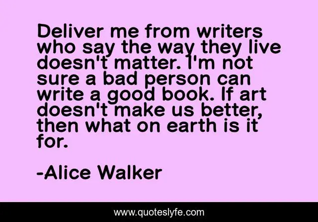 This page presents the quote "Deliver me from writers who say the way they live doesn't matter. I'm not sure a bad person can write a good book. If art doesn't make us better, then what on earth is it for.". Author of this quote is Alice Walker. This quote is about bad, good, art, writing,.