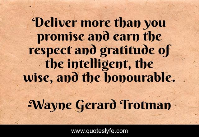 This page presents the quote "Deliver more than you promise and earn the respect and gratitude of the intelligent, the wise, and the honourable.". Author of this quote is Wayne Gerard Trotman. This quote is about gratitude, wisdom, honour, quotable, life-and-sayings, professionalism, intelligence, life-philosophy, work-ethic,.