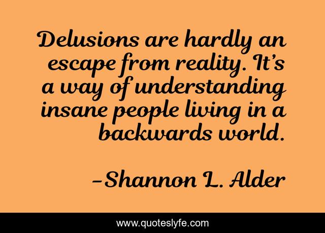 This page presents the quote "Delusions are hardly an escape from reality. It’s a way of understanding insane people living in a backwards world.". Author of this quote is Shannon L. Alder. This quote is about relationships, love, family, insanity, delusions, escape, friendships, affection,.