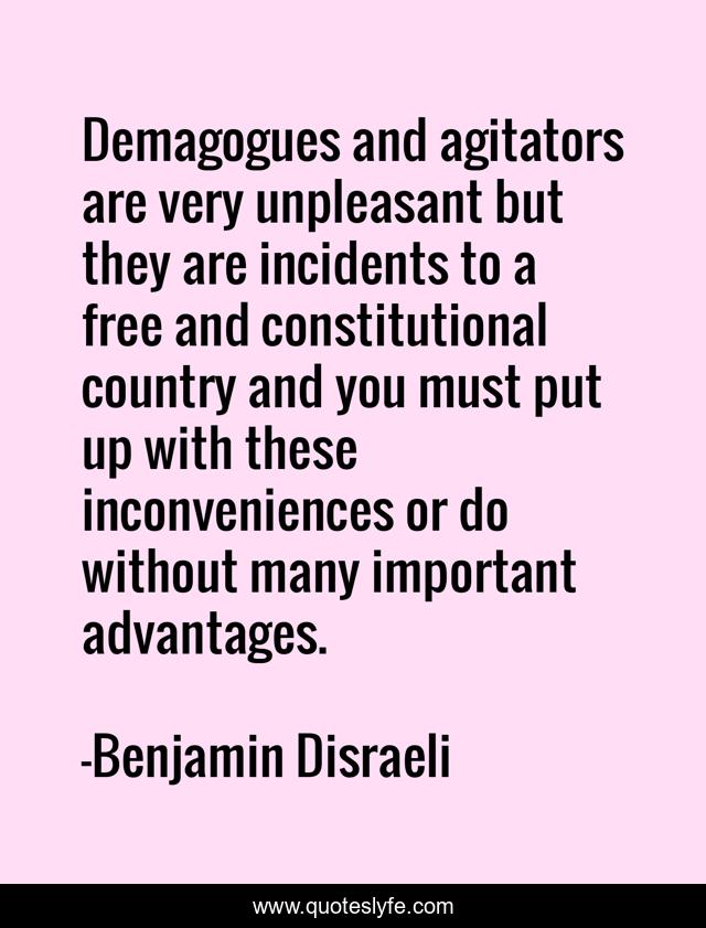 This page presents the quote "Demagogues and agitators are very unpleasant but they are incidents to a free and constitutional country and you must put up with these inconveniences or do without many important advantages.". Author of this quote is Benjamin Disraeli. .