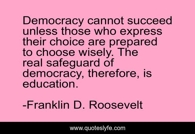 This page presents the quote "Democracy cannot succeed unless those who express their choice are prepared to choose wisely. The real safeguard of democracy, therefore, is education.". Author of this quote is Franklin D. Roosevelt. This quote is about public-duty, voting, education, political-philosophy, government,.