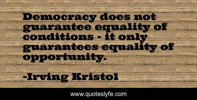 This page presents the quote "Democracy does not guarantee equality of conditions - it only guarantees equality of opportunity.". Author of this quote is Irving Kristol. This quote is about opportunity, democracy,.