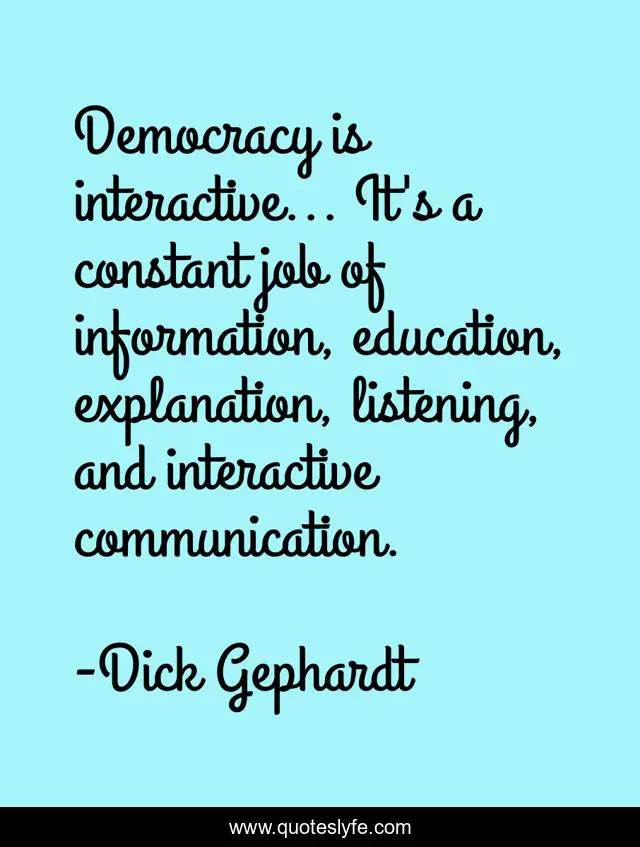 This page presents the quote "Democracy is interactive... It's a constant job of information, education, explanation, listening, and interactive communication.". Author of this quote is Dick Gephardt. This quote is about job, education, democracy,.